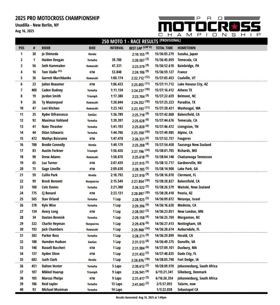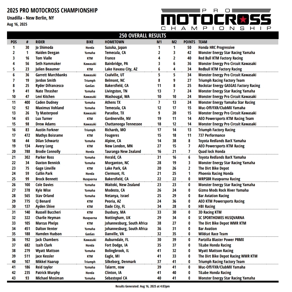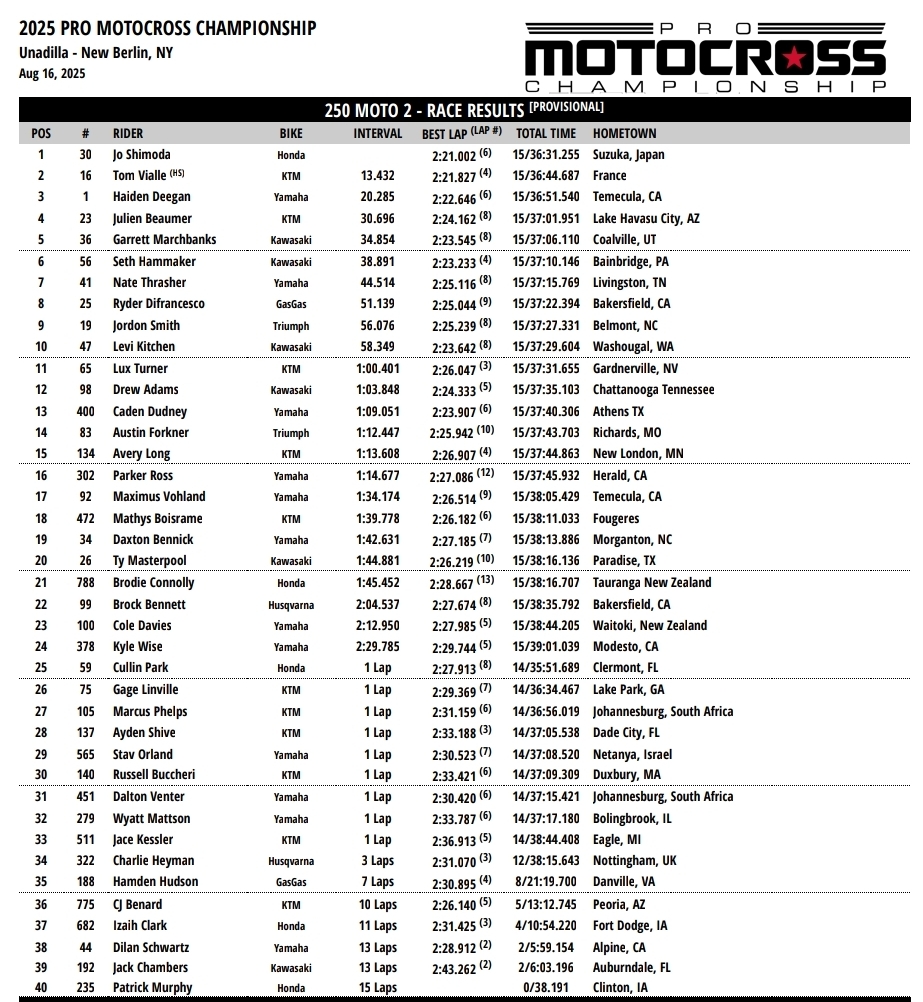 Race Two: Jo Shimoda took the win again in another class rode but this time Tom Vialle kept getting pressure on for most of the moto before finally relenting in the kast three laps as Shimoda pulled out to a comfortable lead to keep the title fight going to Budds Creek after Haiden Deegan started tenth and came back to third but Shimoda and Vialle were long gone by the time he got there. Deegan has a 43 point lead going into the final round at Budds Creek.
