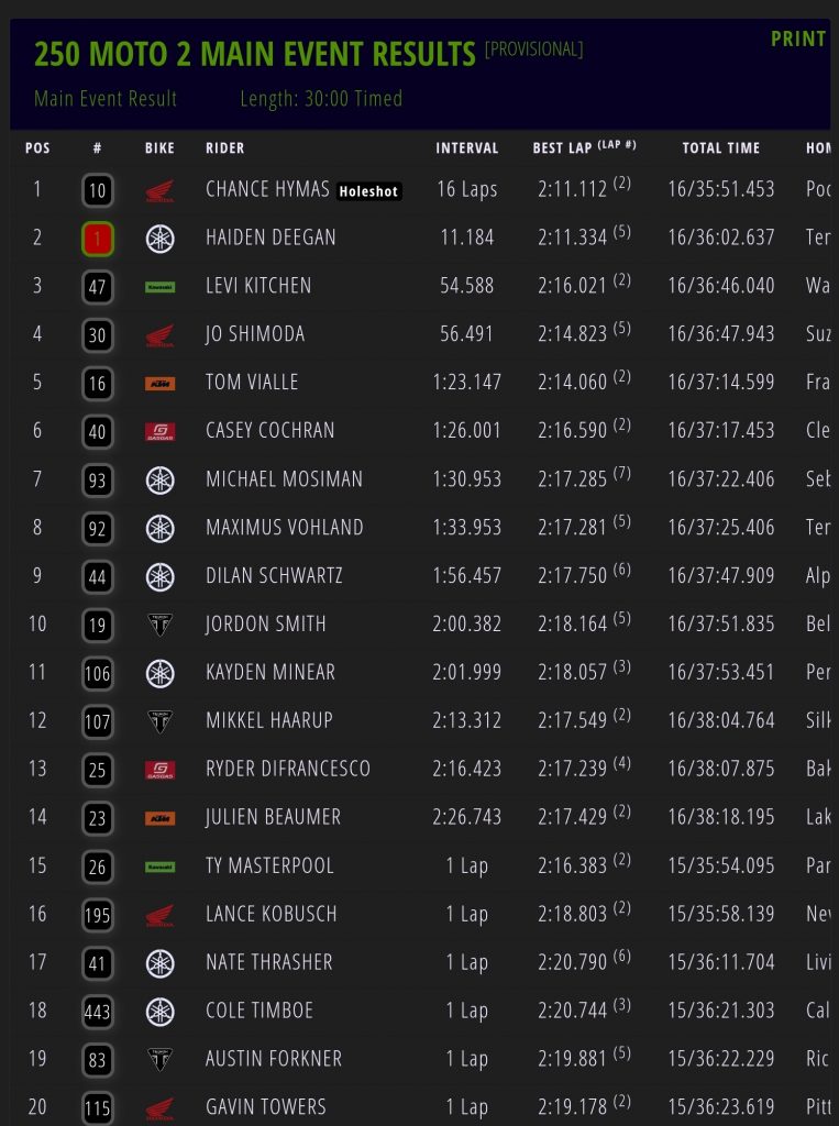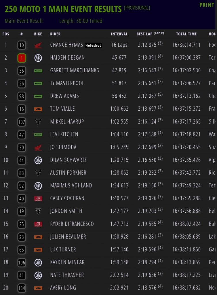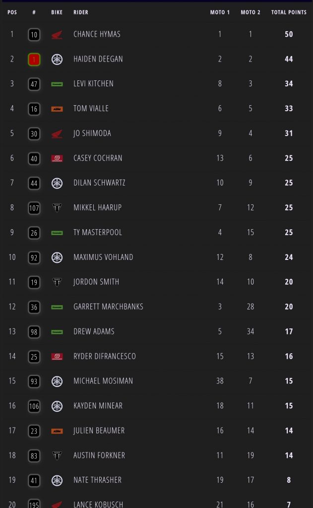 Race Two: Chance Hymas and Haiden Deegan checked out from the field by nearly a minute but it was Hymas who took the win despite a charge by Deegan until a crash halted his progress. Deegan still put on a late charge but Hymas upped his pace again to ensure he went 1-1 to end the moto and overall streak Deegan had going at the first two rounds. Levi Kitchen passed Jo Shimoda to get on the podium with two laps to go as Mikkel Haarup came from last after a crash on lap one all the way back to 12th in a great ride.