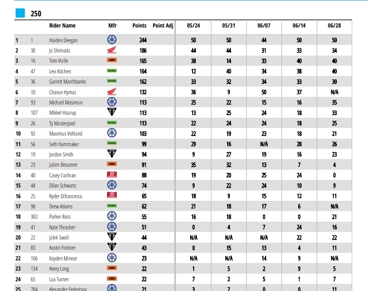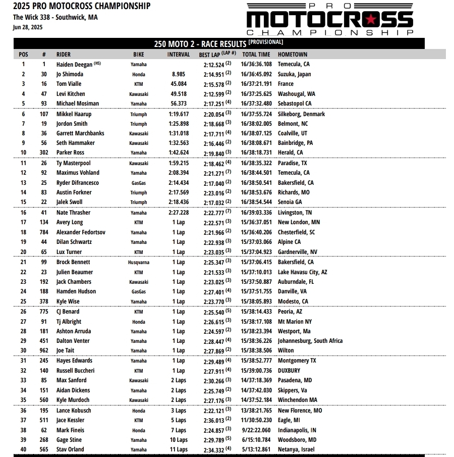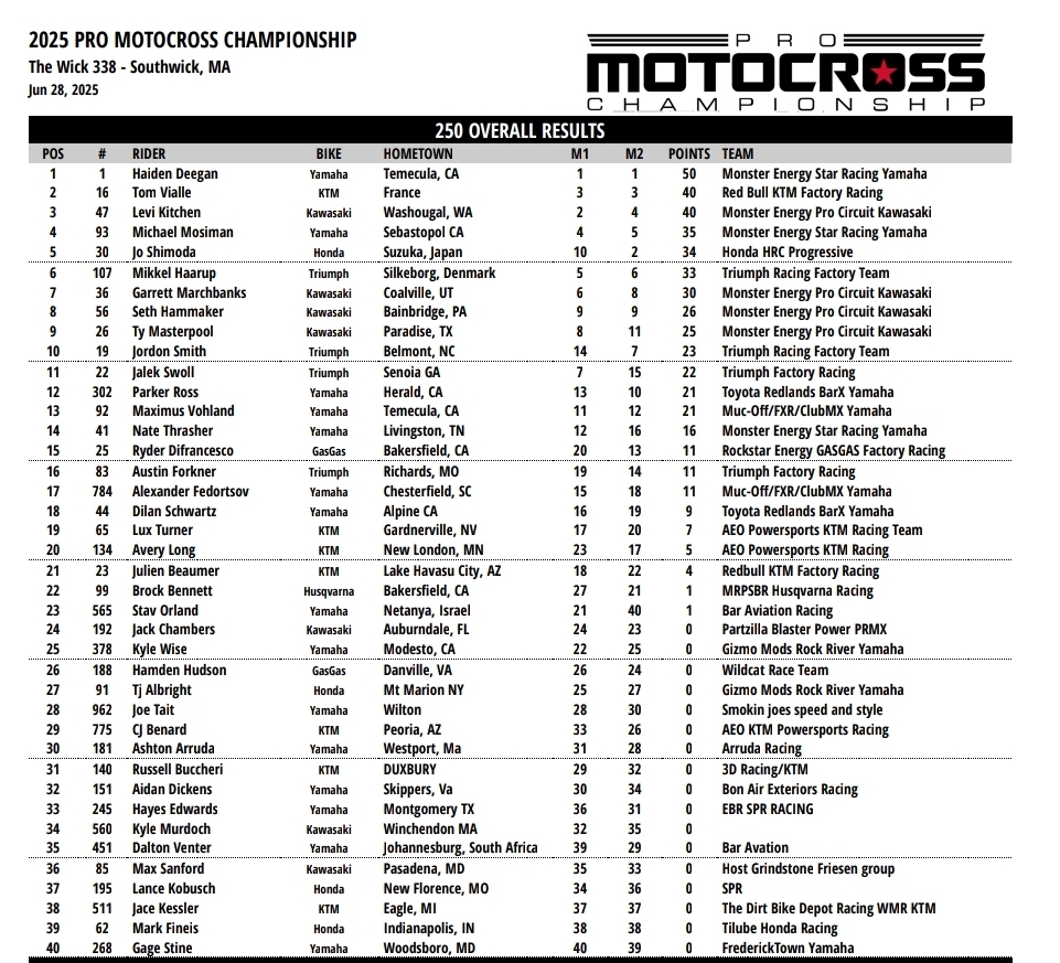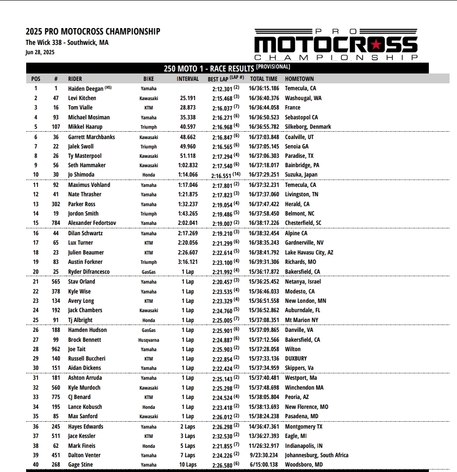 Race One: Haiden Deegan took the holeshot and ran away with the win as Tom Vialle went down on lap one while third after being distracted by a msitake from second place Mosiman! Vialle got up in 11th and had his best ride of the year coming all the way back to third, passing Mosiman on the last lap and finally, and looking like the old Vialle outdoors. Levi Kitchen had a strong ride for second, passing Mosiman ont he last lap as well, with Mosiman going from second to fourth and Mikkel Haarup a strong fifth.