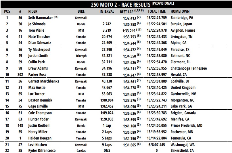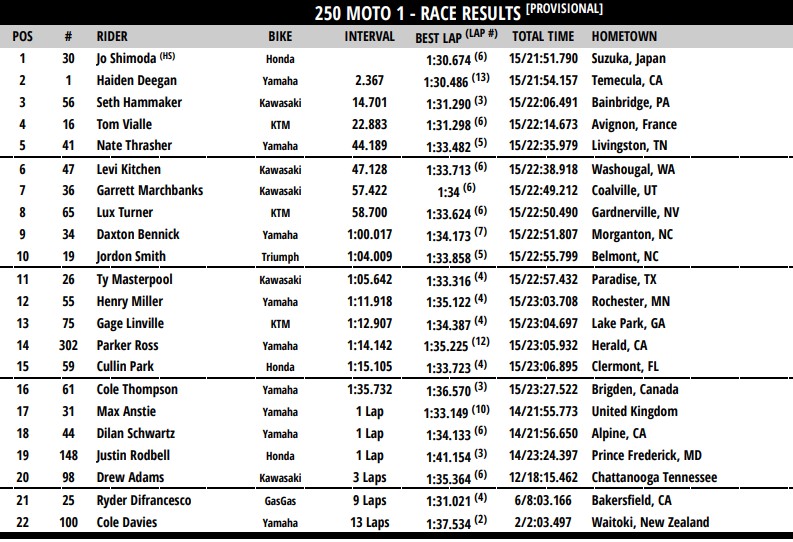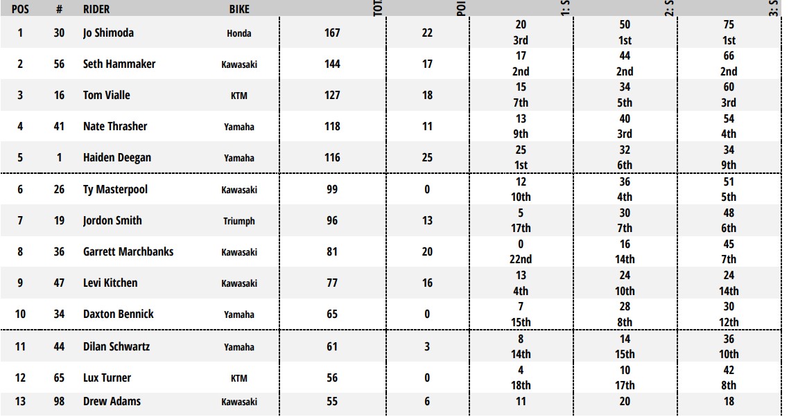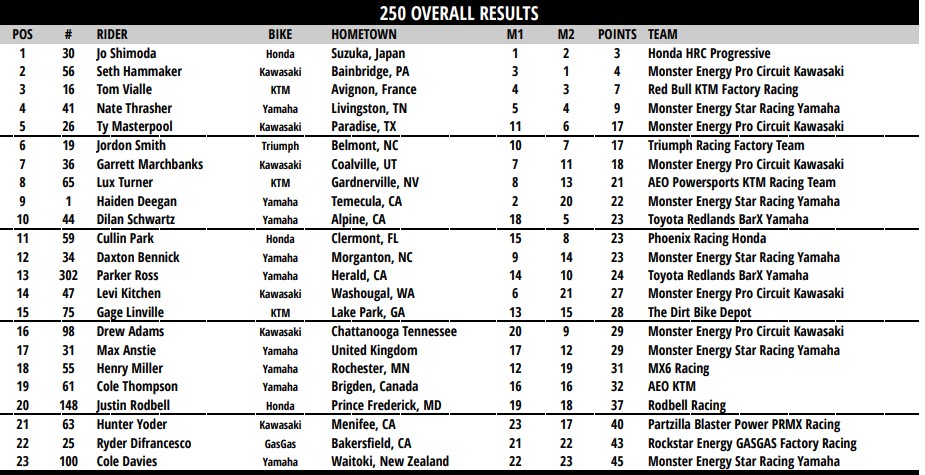 Race One: Jo Shimoda took the win in the first race to get closer to the SMX title. Haiden Deegan ended up second with Seth Hammaker third.