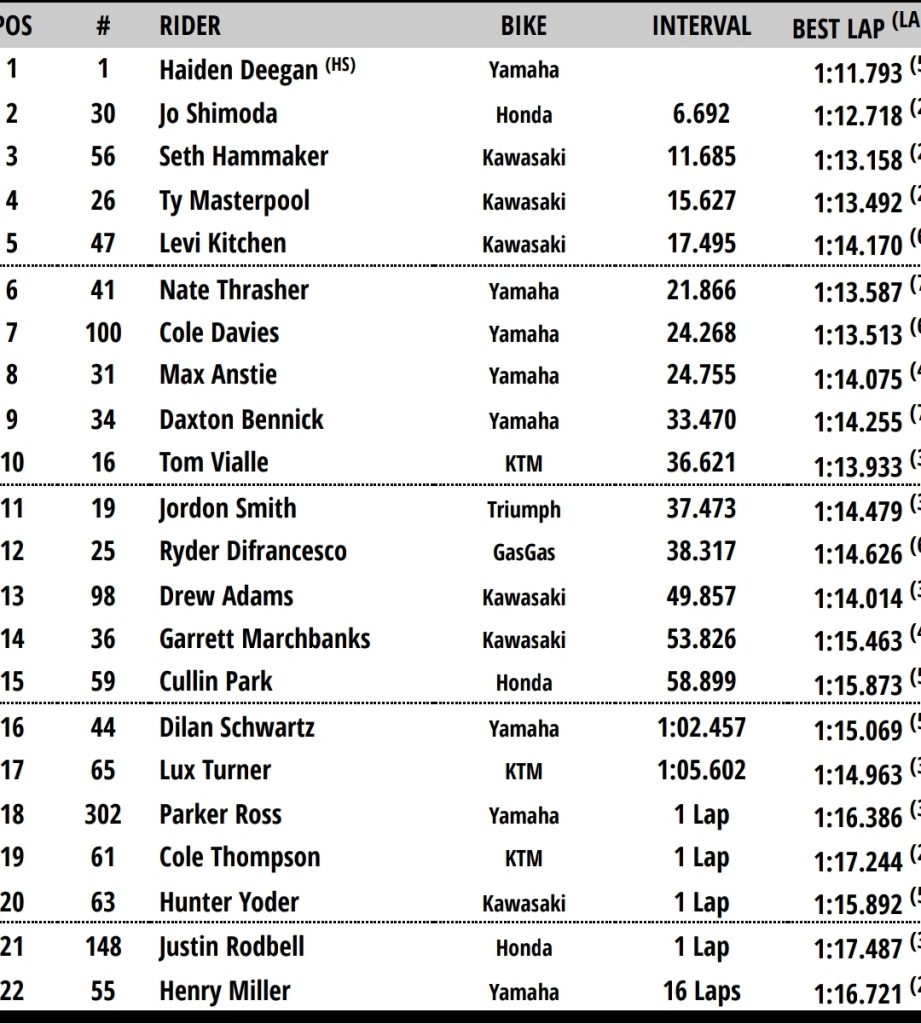 Moto one: Haiden Deegan sprinted away from Jo Shimoda to a 9 second lead until a tip-over cost him five seconds but, even then, Shimoda didn’t have the pace to attack as Deegan pulled away again to a dominant victory. But Deegan said he was, “pissed off,” after the crash despite the win. Jo Shimoda refused the tv interview due to not feeling well.