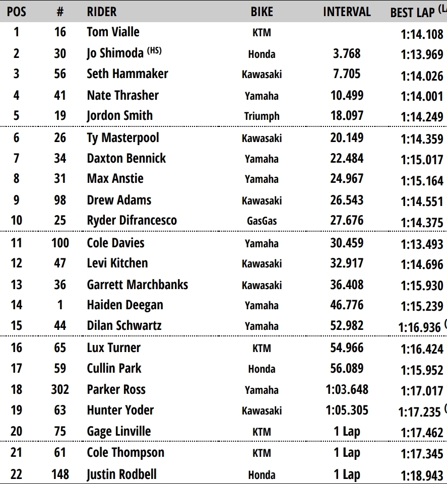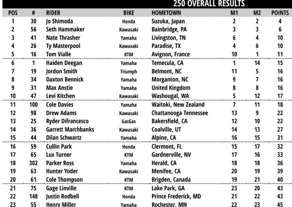 Moto two: Levi Kitchen turned the series upside down when he sent himself and Deegan upside down with an aggressive move on lap one of moto two! Tom Vialle won the moto with an ill Jo Shimoda second, good enough for the overall win and the championship lead!