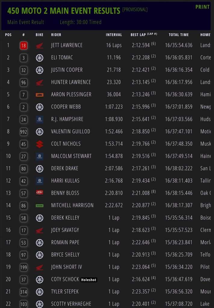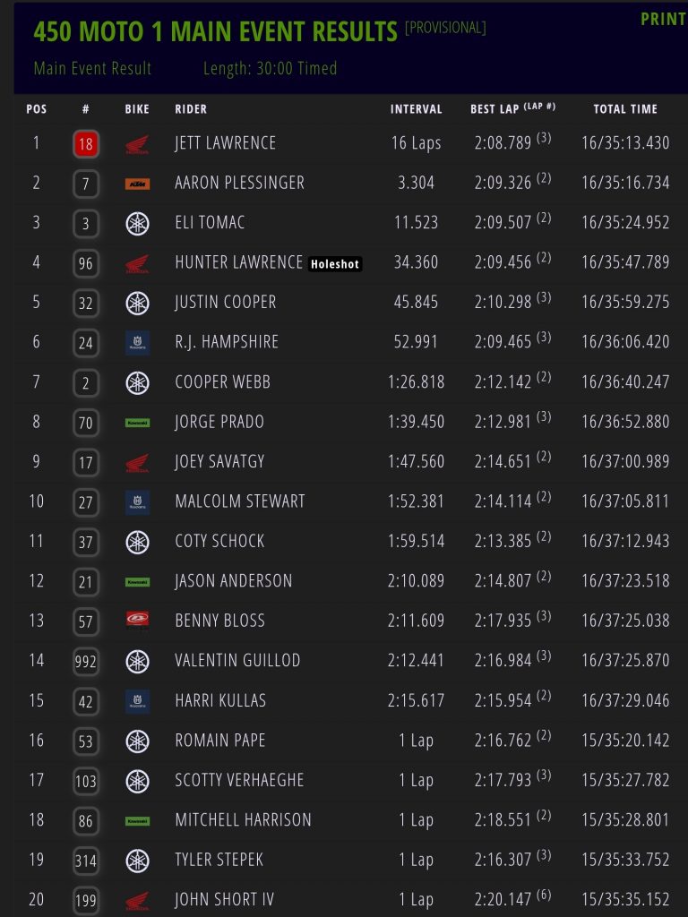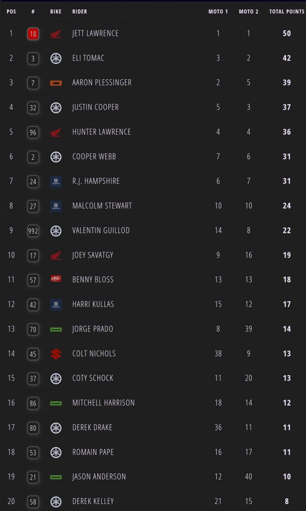 Race One:  Jett Lawrence took the win but it wasn’t easy after Jett passed Plessinger and Hunter at once to take the lead on lap one but he could never break away from Plessinger, Hunter or Eli Tomac. Plessinger even passed Jett with four laps to go but Jett passed him back a lap later and did enough, as he always does, to take the win as Hunter crashed on the last lap giving Tomac third.