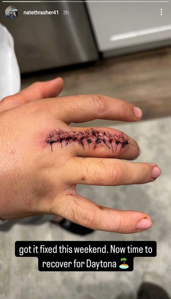 It’s the year of the broken fingers and foot dabs. Nate Thrasher has the former injury and, after a heat race win and fifth place in the main event with a freshly broken finger, Thrasher has now had surgery and it does not look pretty!