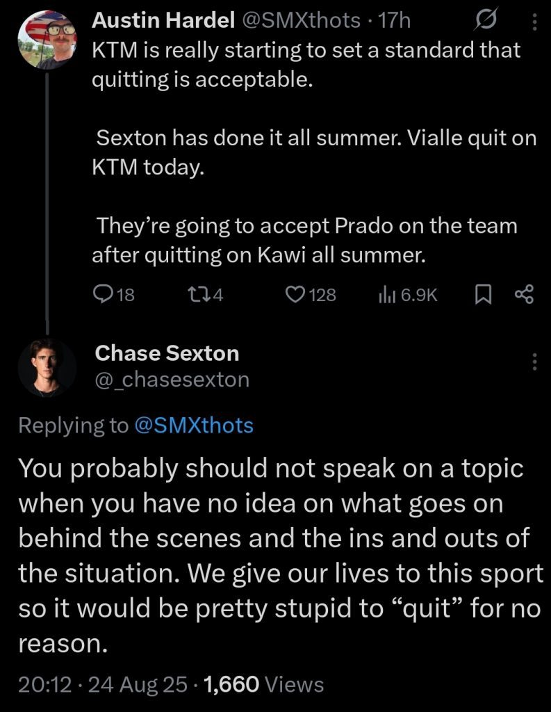 While fans and media can have their opinion, the riders can also have theirs and, just like Eli Tomac a couple of weeks ago to Steve Matthes, Chase Sexton has hit back at a fan online who suggested, he, Vialle and Prado where quitters.