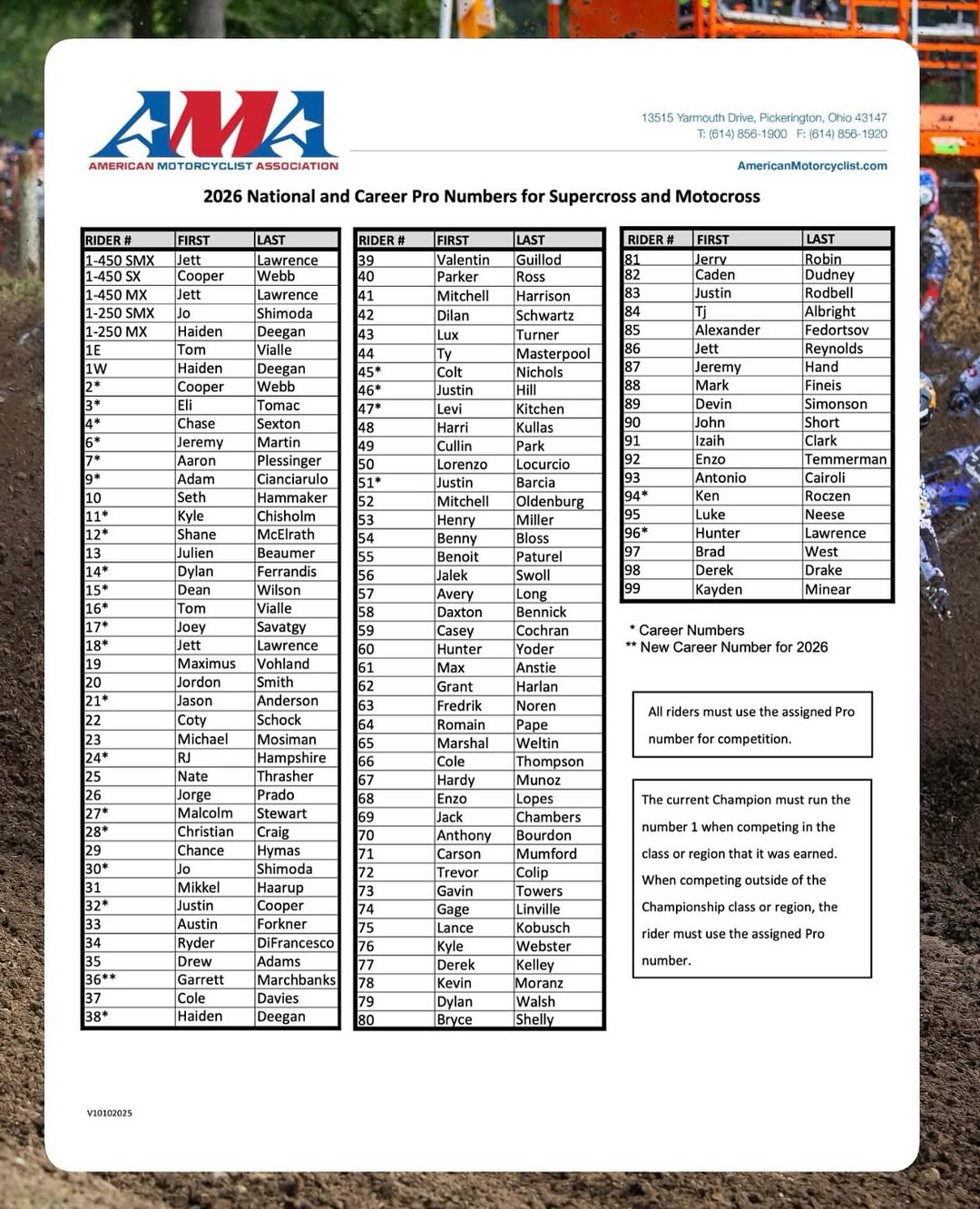 With the 2026 season on the horizon, the American Motorcyclist Association announced the professional competition numbers for the pro-licensed riders participating in the upcoming AMA Supercross and AMA Pro Motocross championships.