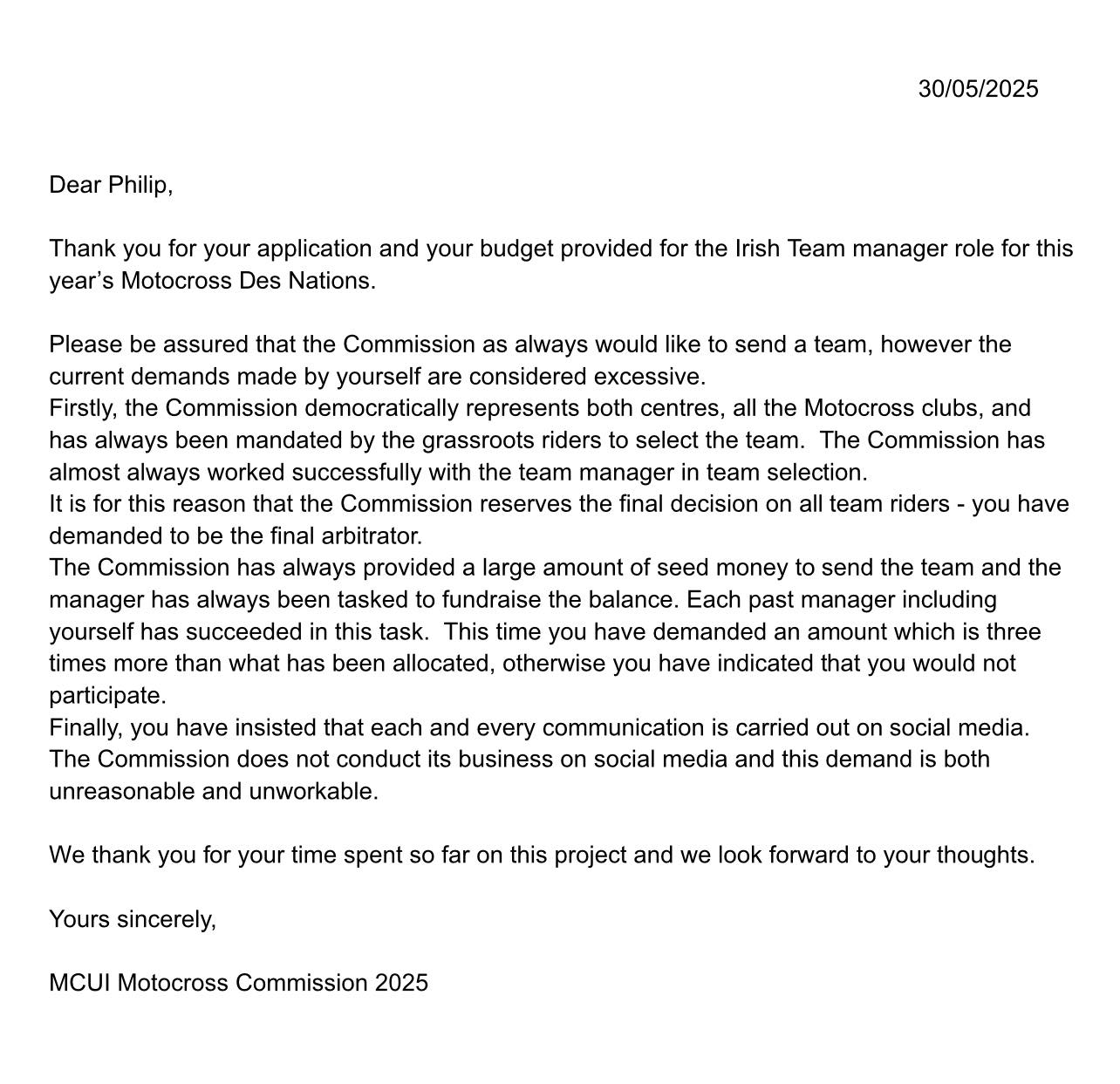 I could write a very detailed response to this (and I still may) but for now, I will leave this up to the riders, licence holders, parents and fans to come to their own conclusions on the contents of this email.