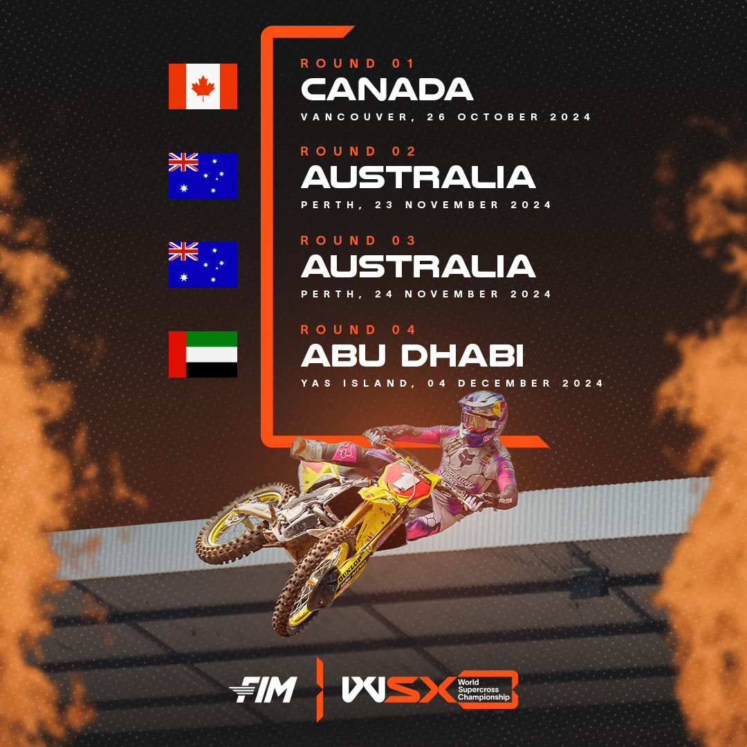 SX Global, the official promoters of the FIM World Supercross Championship (WSX), today revealed a four-event schedule for the series’ upcoming 2024 season, announcing rounds in Canada, Australia and the United Arab Emirates.