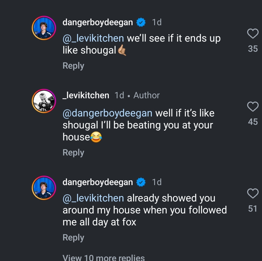Kitchen posted a video of himself getting ready for A1 and Deegan said: “easy top 3.” This led to Kitchen calling Deegan out for skipping MXoN this year before they both went after each other again for their battles/wins last season outdoors.