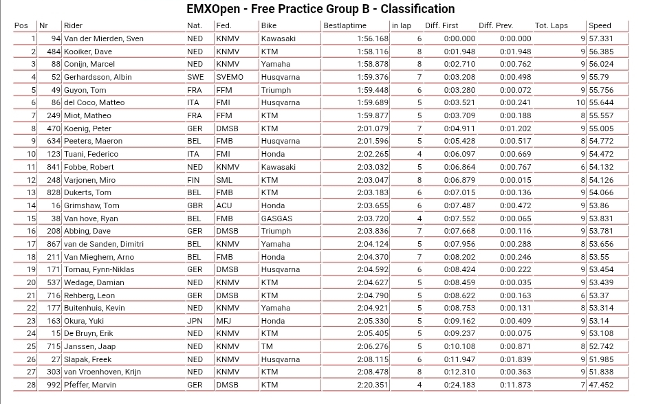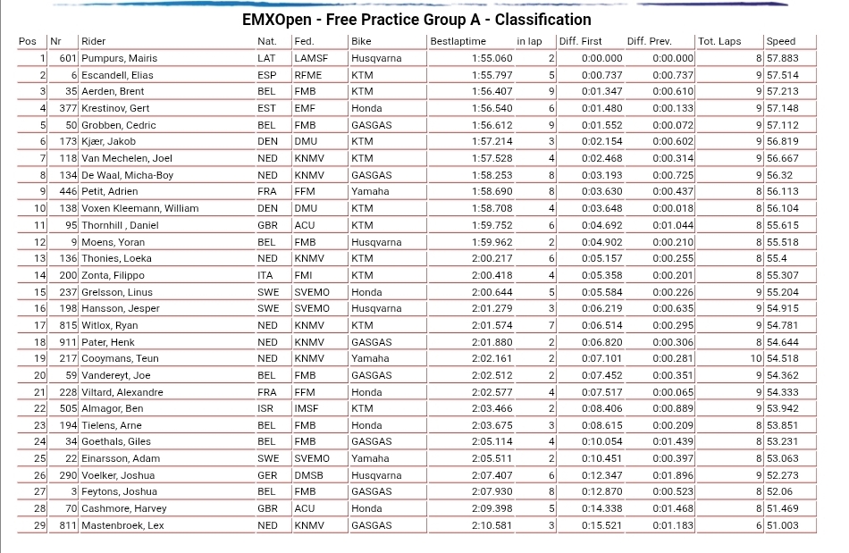 Mairis Pumpers and Sven Van der Mierden topped their respective groups in EMX Open in first practice at Lommel – the flattest the track will be all weekend!