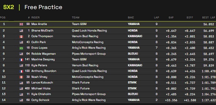 Max Anstie was fastest in the first SX2 free practice session with Shane McElrath second fastest.