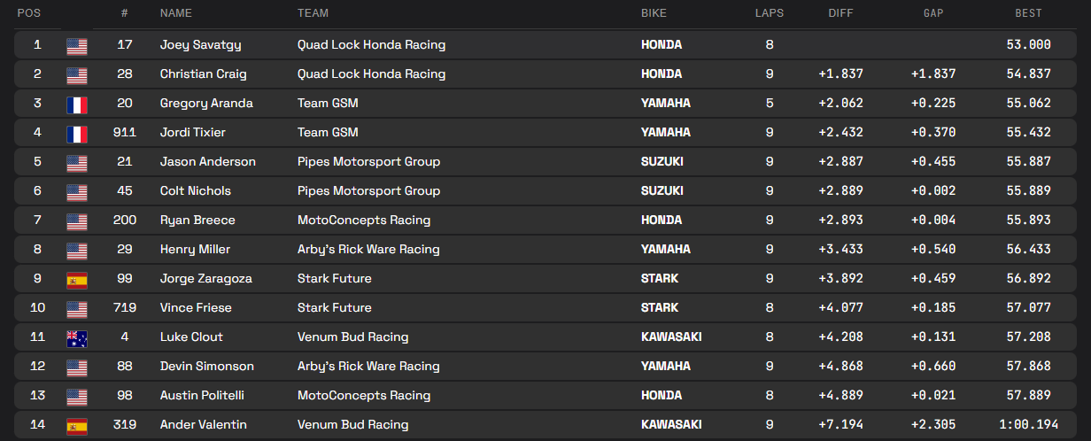 In SX1, Joey Savatgy set the early pace in a Quad Lock Honda 1-2 in free practice. Christian Craig was second fastest.