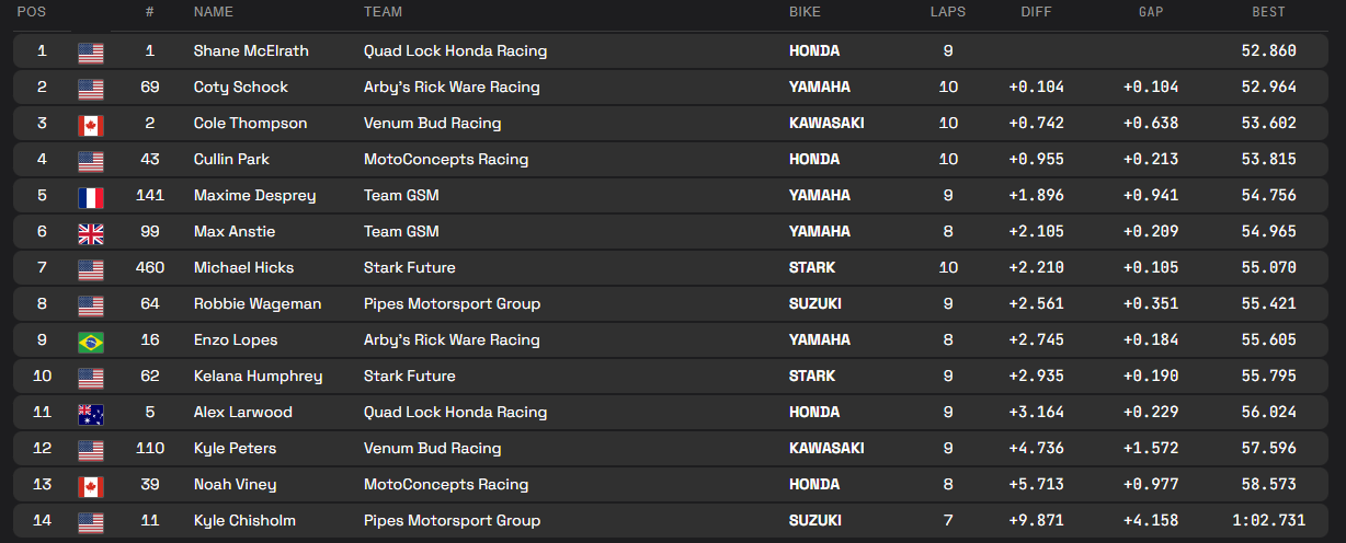 In SX2, Shane McElrath set the pace in free practice over Coty Schock with Cole Thompson third fastest.