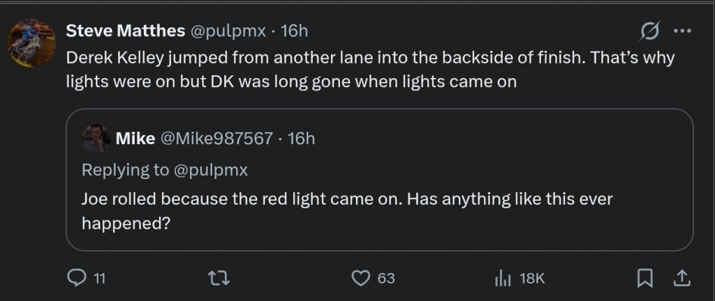 Shimoda said: “I think it’s under Investigation right now. I did see a red light on the double so I had to slow down, I had to roll the jump and I couldn’t get enough momentum to jump to finish line because the finish line. But yes, when I went through it was red, but no-one was down. It would make sense to me if someone was down before I hit the jump and right right when I roll the jump it turned off, it makes sense.