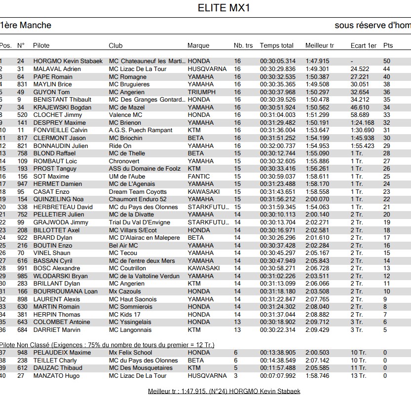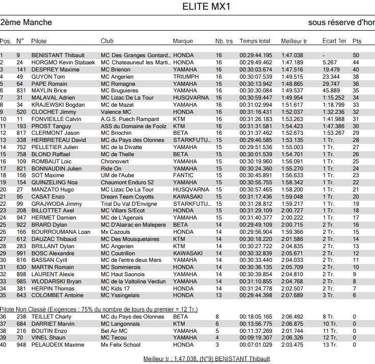 FranceMX1 race results: French Elite RD2 – Saint-Jean d’Angély Andy McKinstry2 minutes ago2 minutes ago1 mins Image: Elite MX Facebook Twitter WhatsApp Messenger Email Race One: Race Two: This article continues below Overall: Championship standings: Post navigation Previous: MX2 race results: French Elite RD2 – Saint-Jean d’Angély