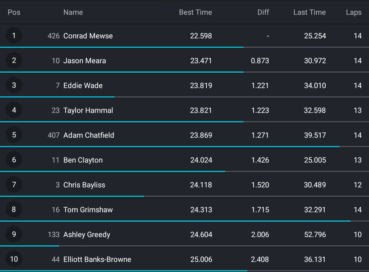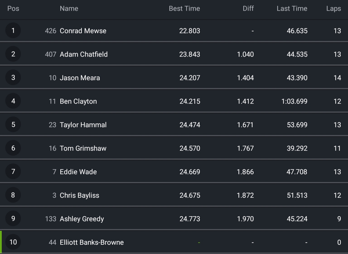 In the second group, Mewse was quickest again ahead of Chatfield and Meara but it is Wilson on pole.
