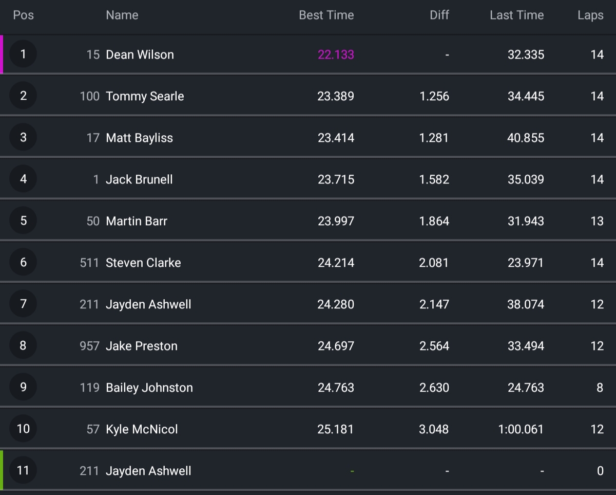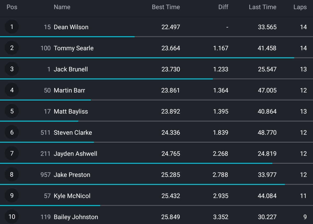 In the second session, it was Wilson who topped the first group putting in a blinder of a lap. Searle was second with Bayliss third. Barr made a few mistakes but still ended up fifth fastest in the group.