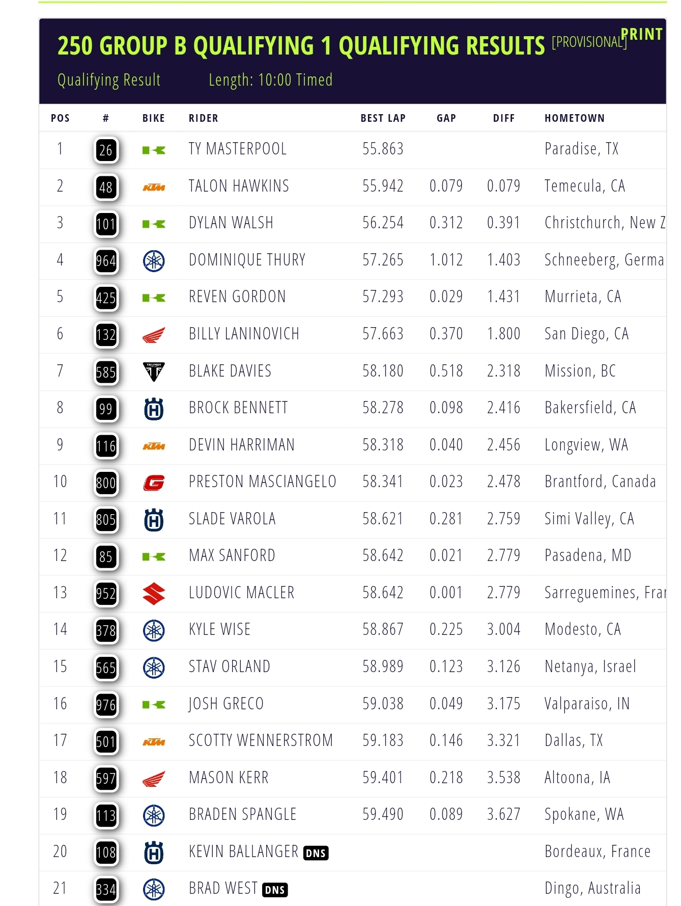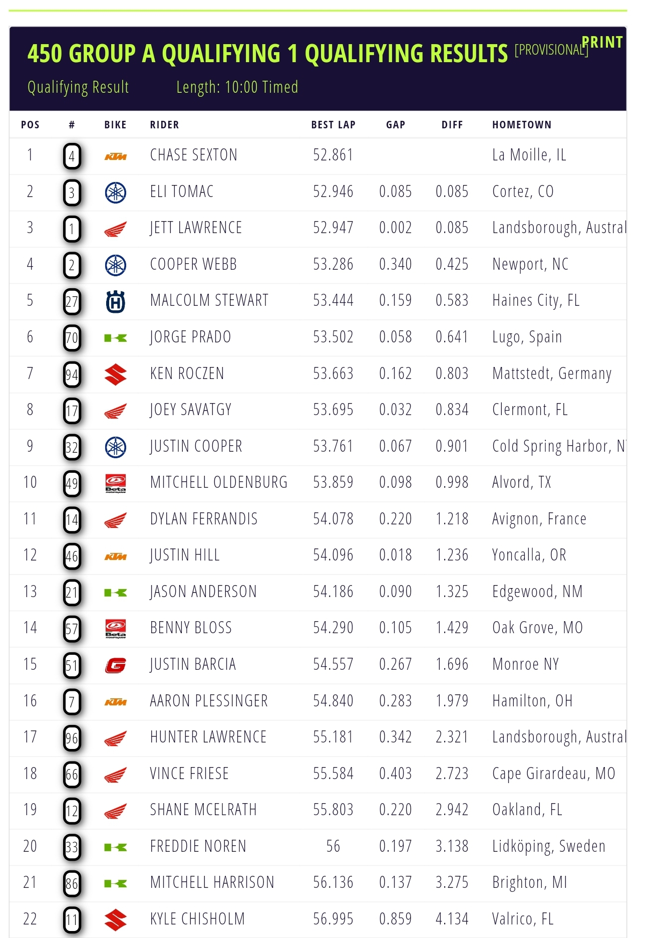 Chase Sexton went quickest in his final lap of Q1 to go one tenth quicker than Eli Tomac and Jett Lawrence… all three and been on the same tenth of a second until that point! One second separated the top ten with Jorge Prado an impressive sixth and jumping the whoops – both skimming and jumping appear to be an option today!