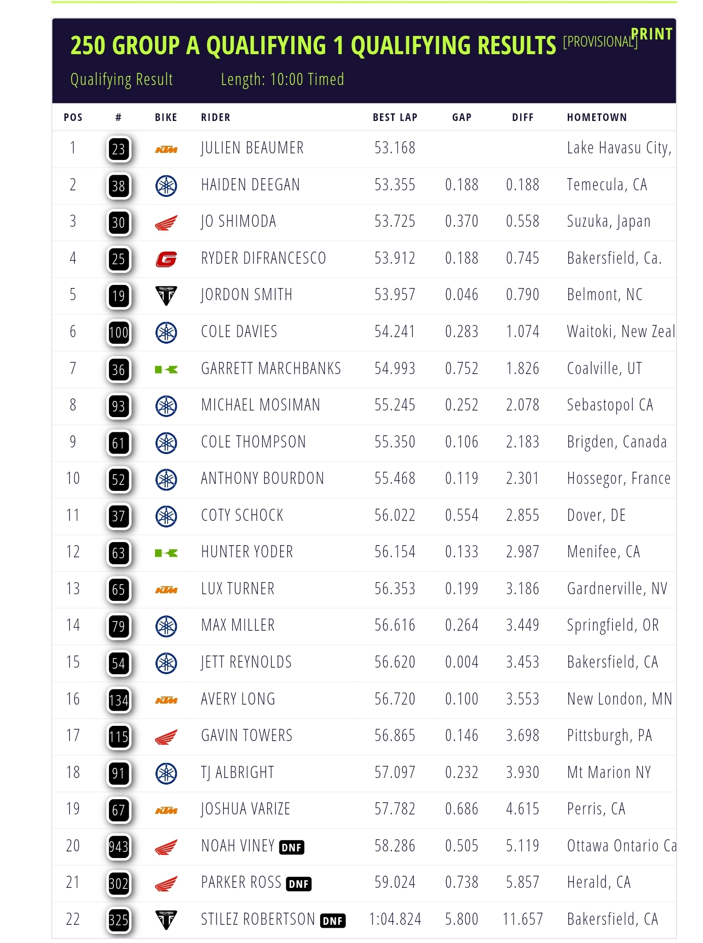 In the 250 class it was Julien Beaumer who did a Chase Sexton and took the fastest time off Haiden Deegan in the final lap of qualifying to underline, for the second weekend in row that he has the raw pace of the heavy title favourite Deegan.