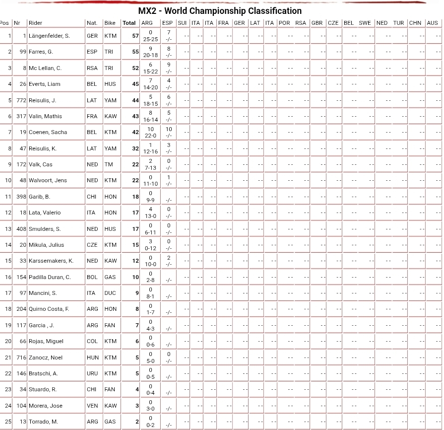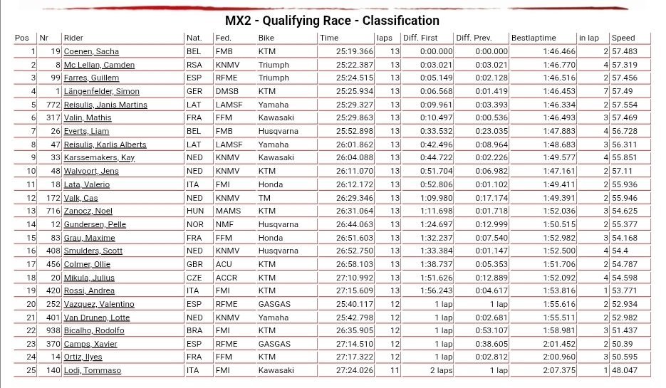 MX2 Qualifying race: Sacha Coenen passed leader Janis Reisulis with two minutes to go to take the win as the rapid rookie Reisulis slipped back to fifth by the as the intense pace at the front saw McLellan, Farres and Längenfelder find their way by in the last couple of laps.