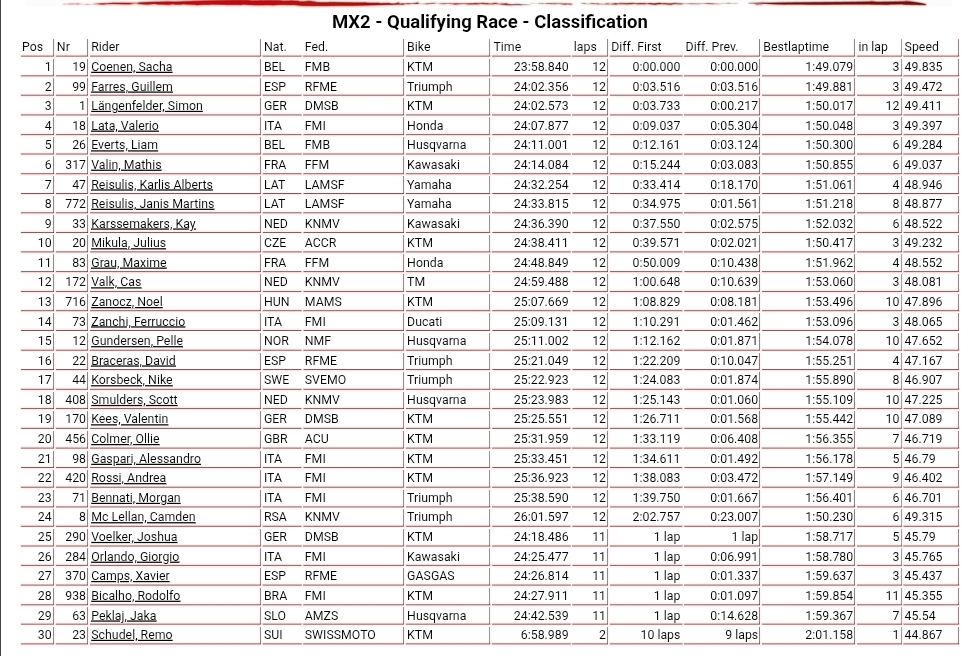 MX2 Qualifying Race: Sacha Coenen led the entire moto take the win from Guillem Farres who just about managed to hold off Simon Längenfelder. Lata took third with Everts fifth. Camden McLellan had a hard crash while chasing Everts for top five putting him out of the points.