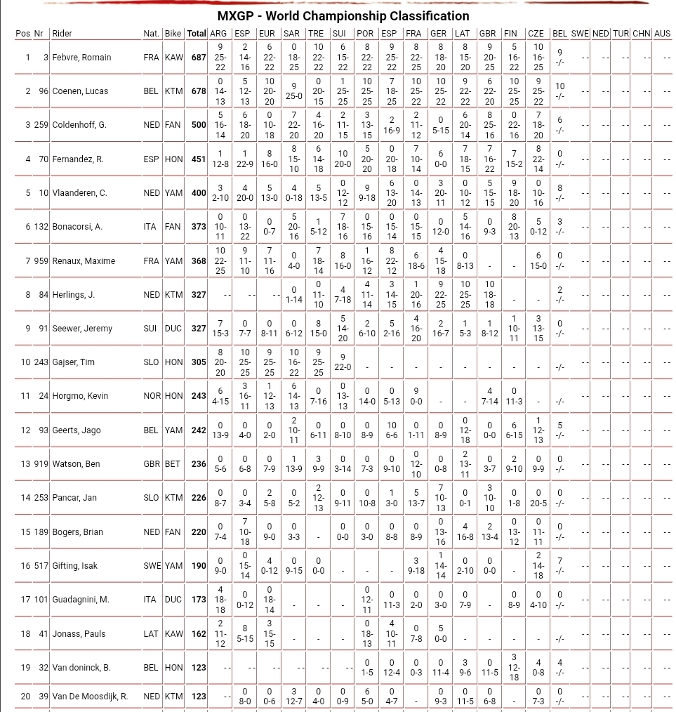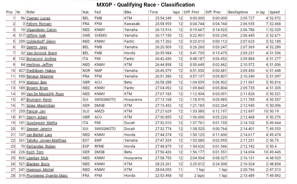 MXGP Qualifying Race: Lucas Coenen worked his way to the front after a mediocre start, passing impressive long time leader, Isak Gifting on the JK Yamaha! Febvre followed Coenen through to take second with Herlings ninth in his comeback race.