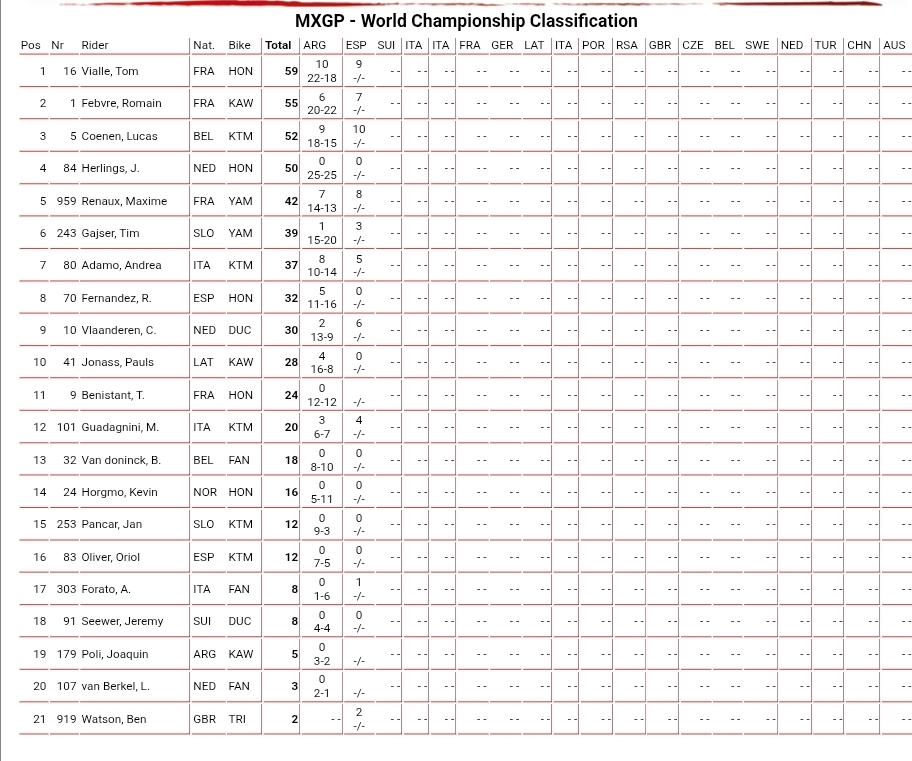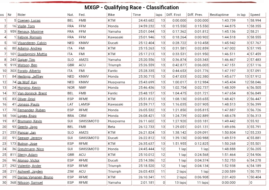 Herlings came from on the deck to 11th with De Wolf 12th but the crash cost Herlings the championship lead as Coenen dominated the race with Vialle second and now the championship leader! Vialle held off a charging Renaux who held Febvre off all moto as Ben Watson impressed with ninth on the Dirt Store Triumph.