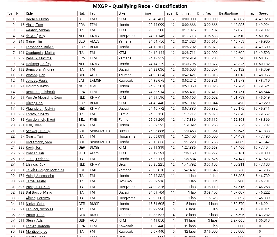 MXGP Qualifying Race: Lucas Coenen held off a determined Tom Vialle to take the win with Adamo not far away in third and De Wolf fourth as the next generation from MX2 took over MXGP! Gajser was the best of the veterans in fifth.
