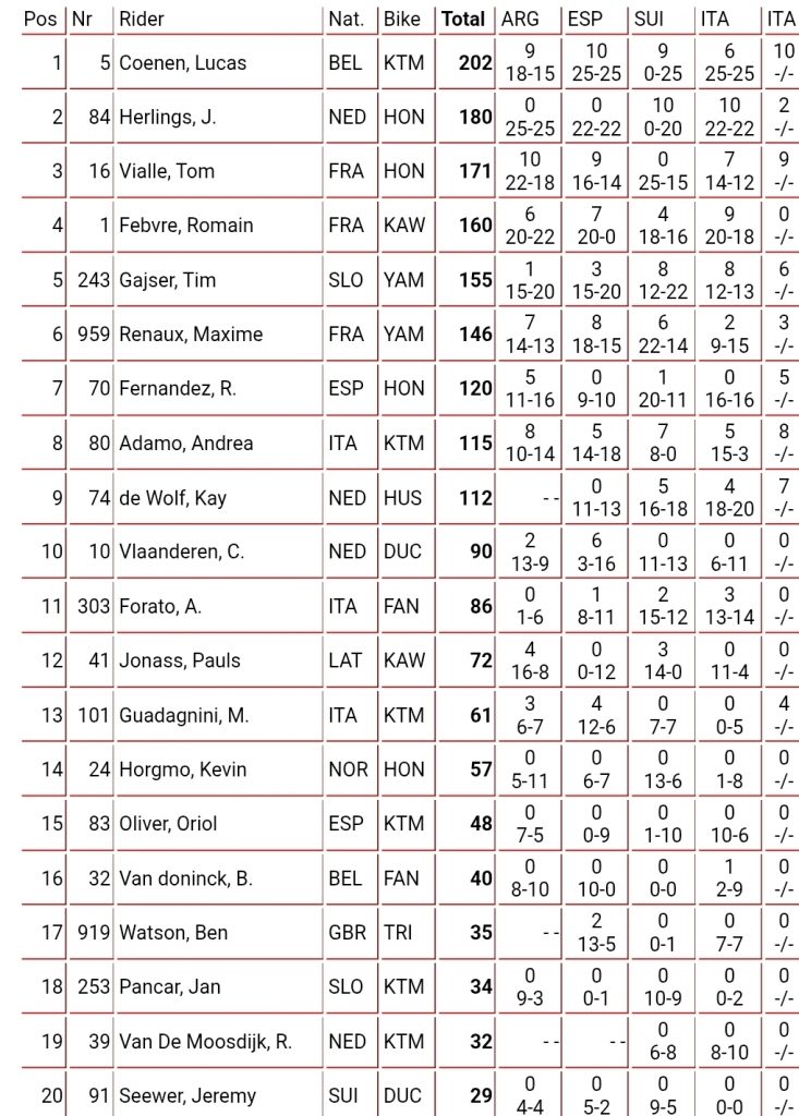 Jeffrey Herlings had a wild race with a bad start in tenth, came through to fourth only to crash and drop back to 21st then get all the way back to 9th and two hard fought points but he lost eight on Coenen and seven on Vialle.