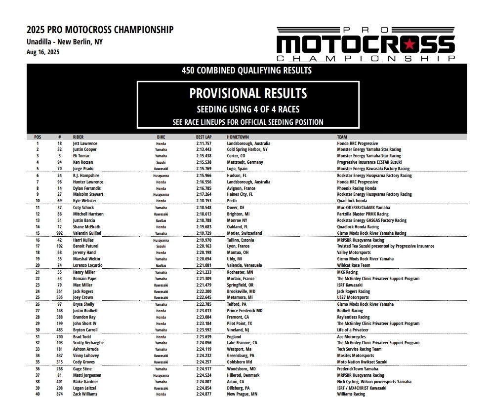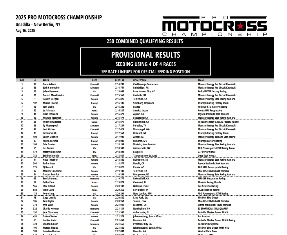 Drew Adams showed what he really capable of to go fastest in the 250 class with Deegan back in fifth. Jett Lawrence time from session one ensured he was the fastest with Roczen fourth and Prado fifth.