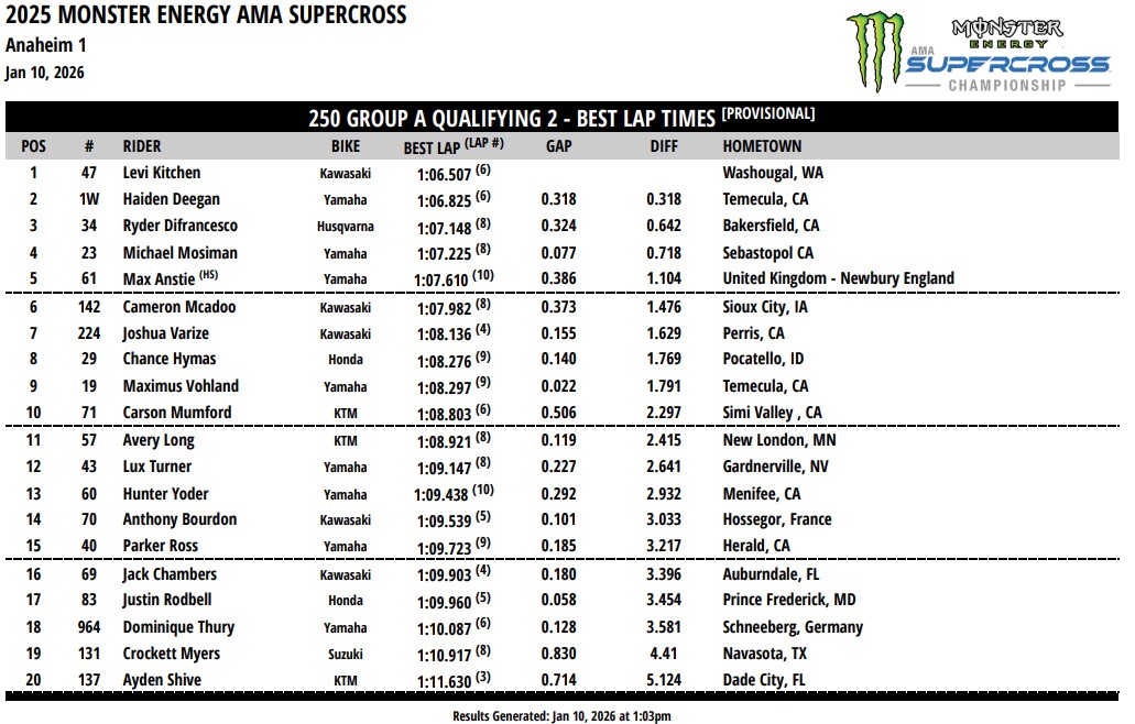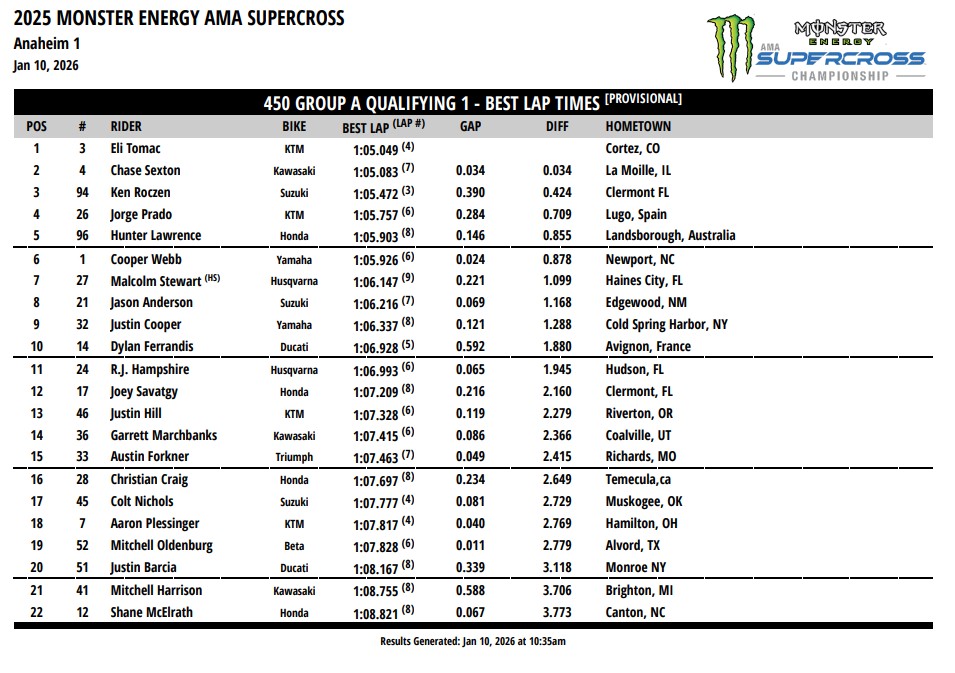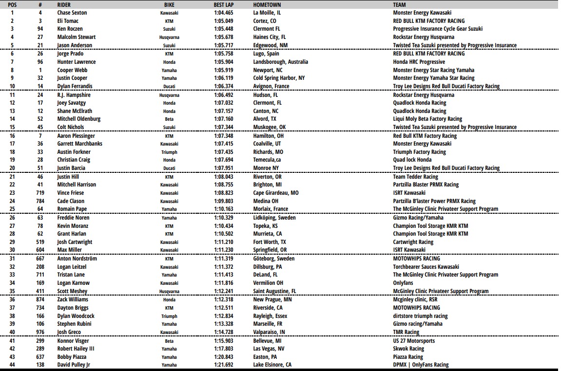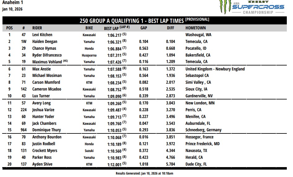 Qualifying results: AMA Supercross RD1 – Anaheim 1 – Sexton and Kitchen on pole