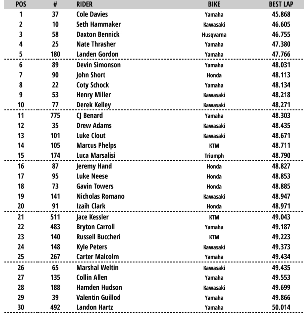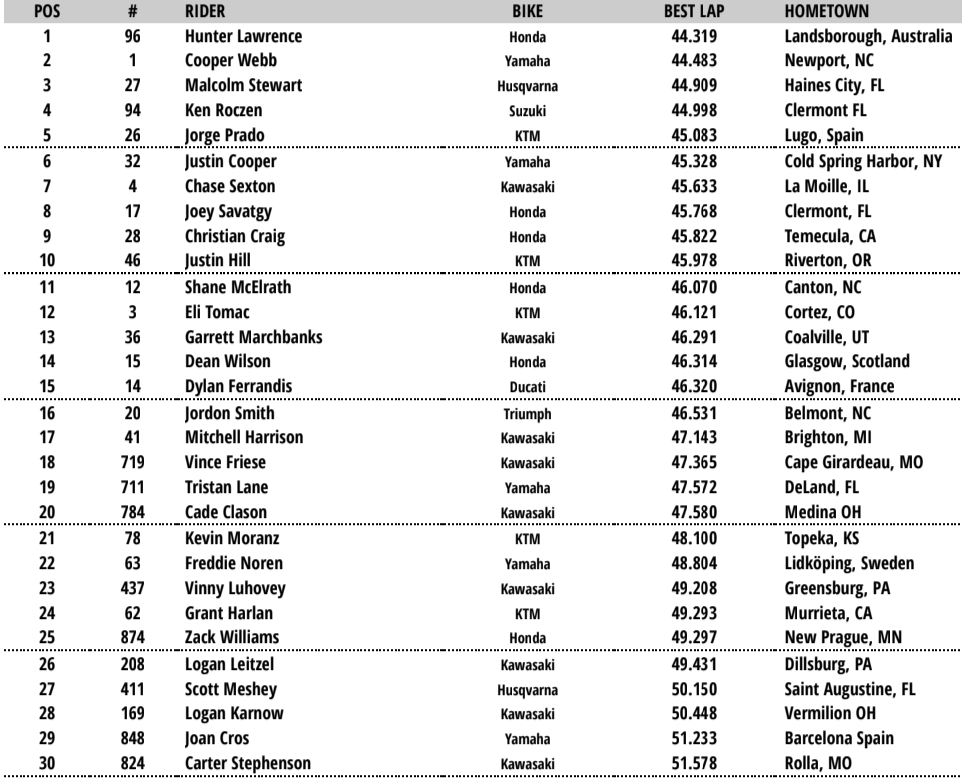 Back on track and it was Hunter Lawrence who won the fastest lap shootout with a flying Cooper Webb with Malcolm Stewart third. Ken Roczen and Jorge Prado rounded out the top five.