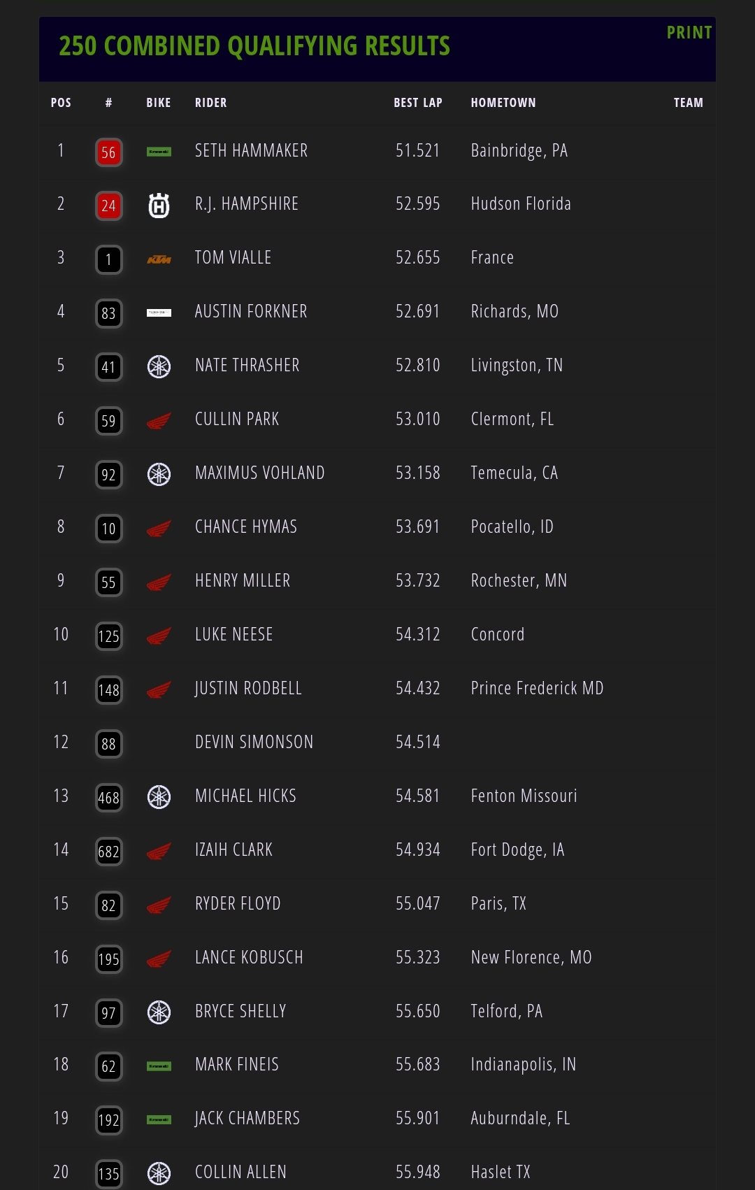 Seth Hammaker was in inspired form to go quickest in the 250 East division, one second faster than title rivals RJ Hampshire and Tom Vialle with Austin Forkner fast again in fourth.