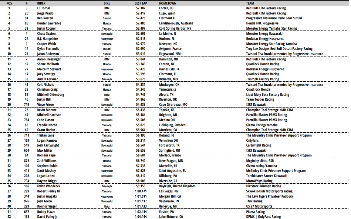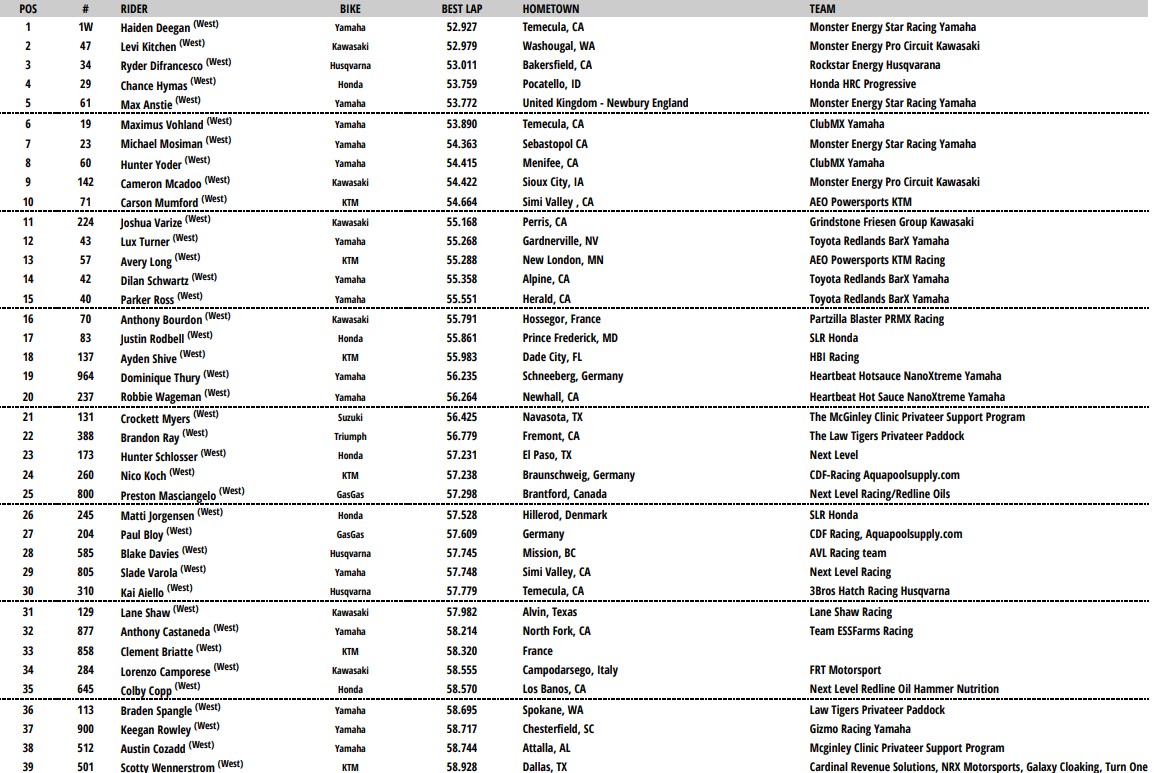 In the 250SX class, it was Levi Kitchen who set the pace in the first session but Haiden Deegan bounced back in Q2 to take pole position but the times are very close between the top three.