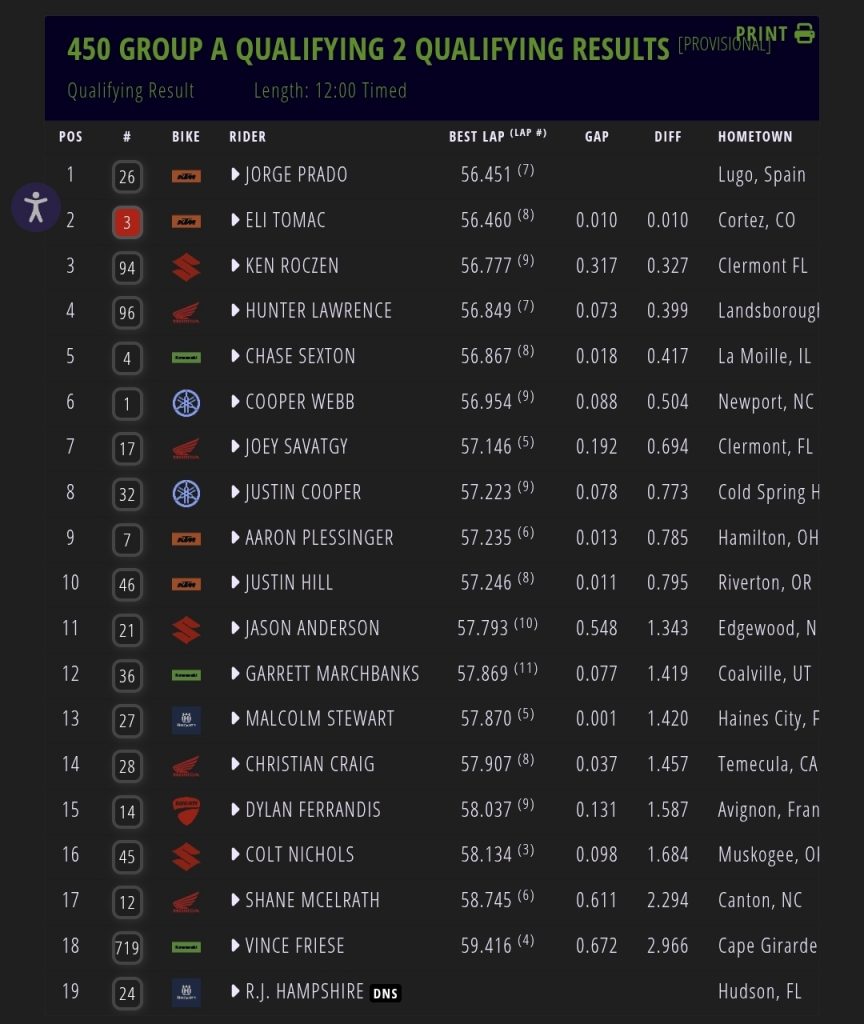 In Q2 Jorge Prado went QUICKEST just one hundredth of a second over Eli Tomac with Ken Roczen third – the four time world champ is learning quick!
