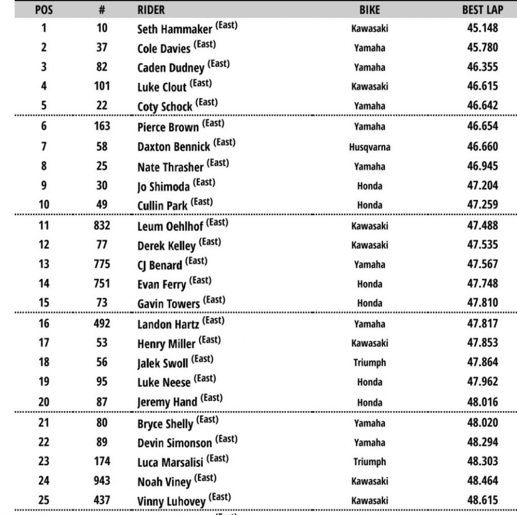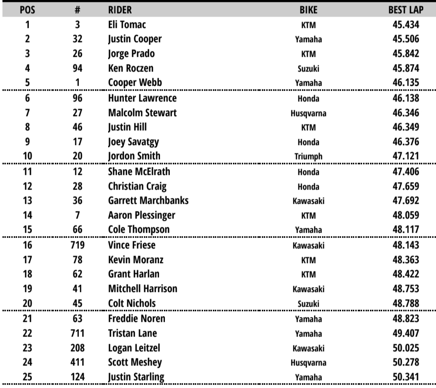Eli Tomac set the pace in the 450 class in Q1 one from Justin Cooper in second and the returning Jorge Prado in third. Seth Hammaker took the fastest time in Q1 and looked really comfortable in the ruts with Cole Davies second.