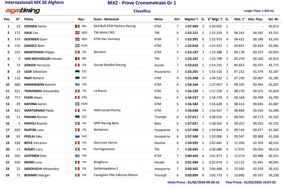 In MX2, Sacha Coenen set a very fast pace in group one going over four seconds faster than Cas Valk with Gyan Doensen third fastest.