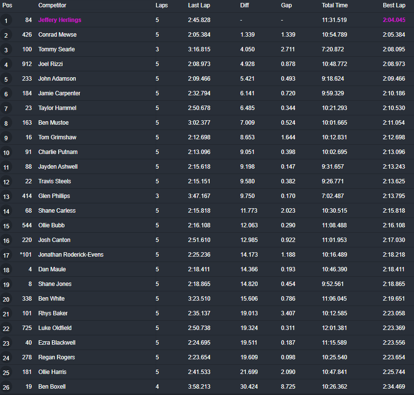Joel Rizzi put in a good lap for fourth with John Adamson rounding out the top five.