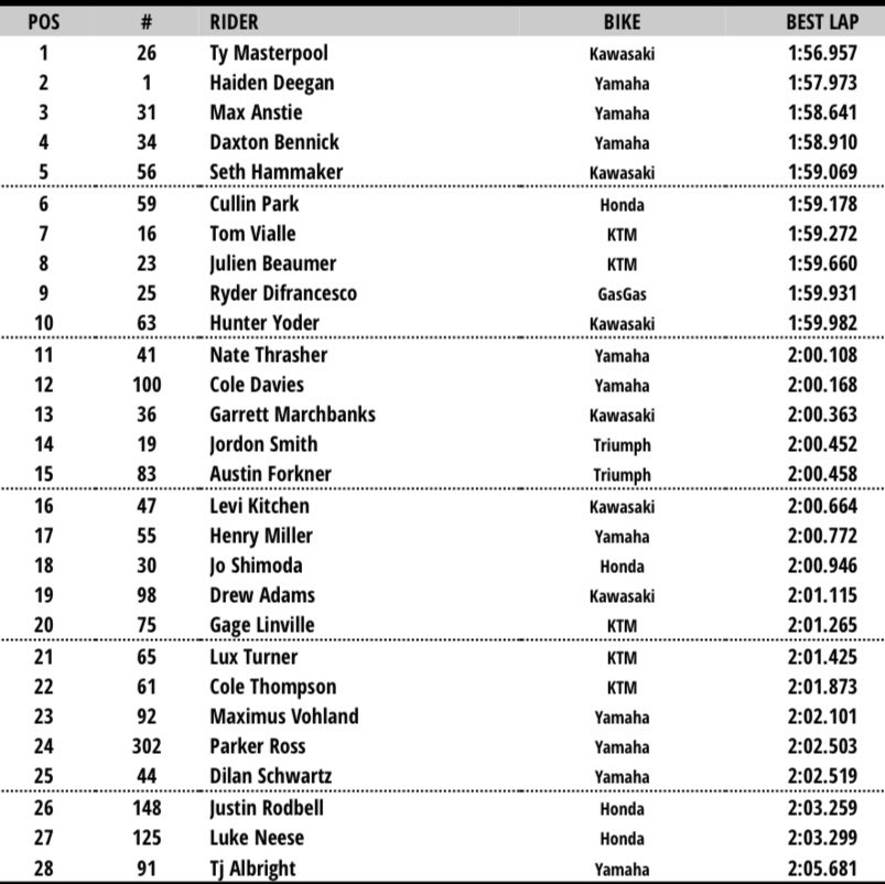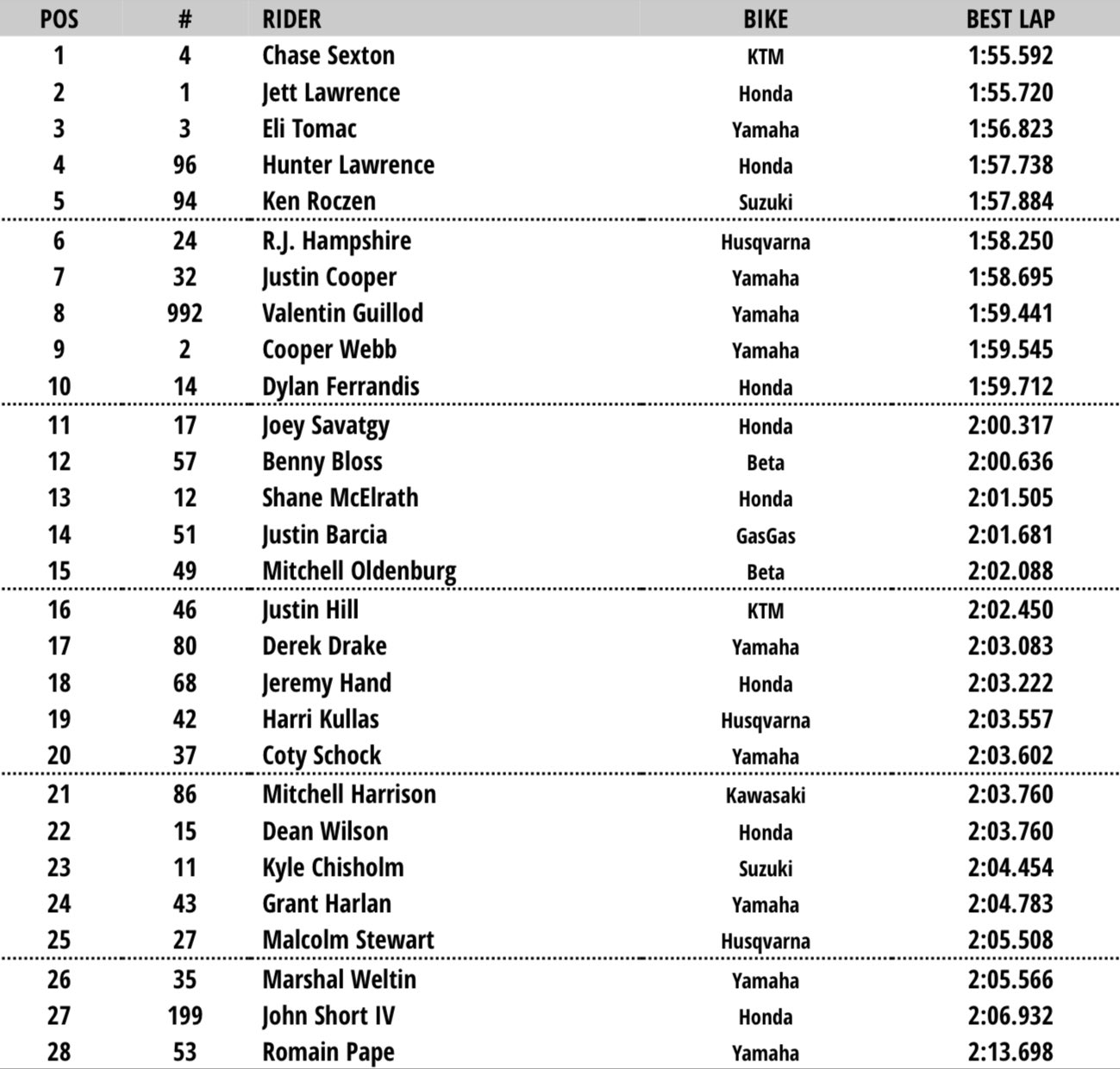 Q1: Chase Sexton edged Jett Lawrence on his last flying lap to go quickest in Q1 with Eli Tomac third and Valentin Guillod eighth ahead of Webb in ninth, on a track that proved tricky for many with big rhythms and deep ruts. Ty Masterpool was quickest in the 250s over Deegan and Max Anstie in Q1, the Brit impressive on his comeback.
