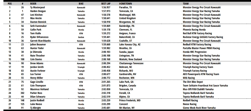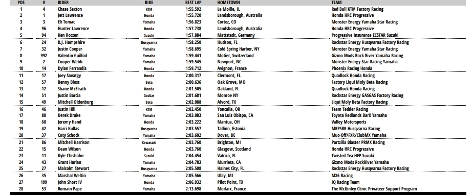 Q2: Levi Kitchen and Jett Lawrence went quickest in Q2 but it was the Q1 times of Sexton and Masterpool that were enough for top spot in both classes. Unfortunately Julien Beaumer went down hard in Q2 and the session had to be red flagged to allow the medics to attend to the stricken KTM rider, safely.