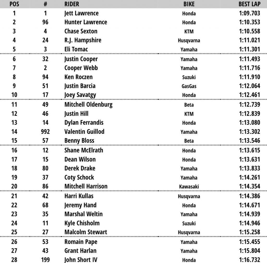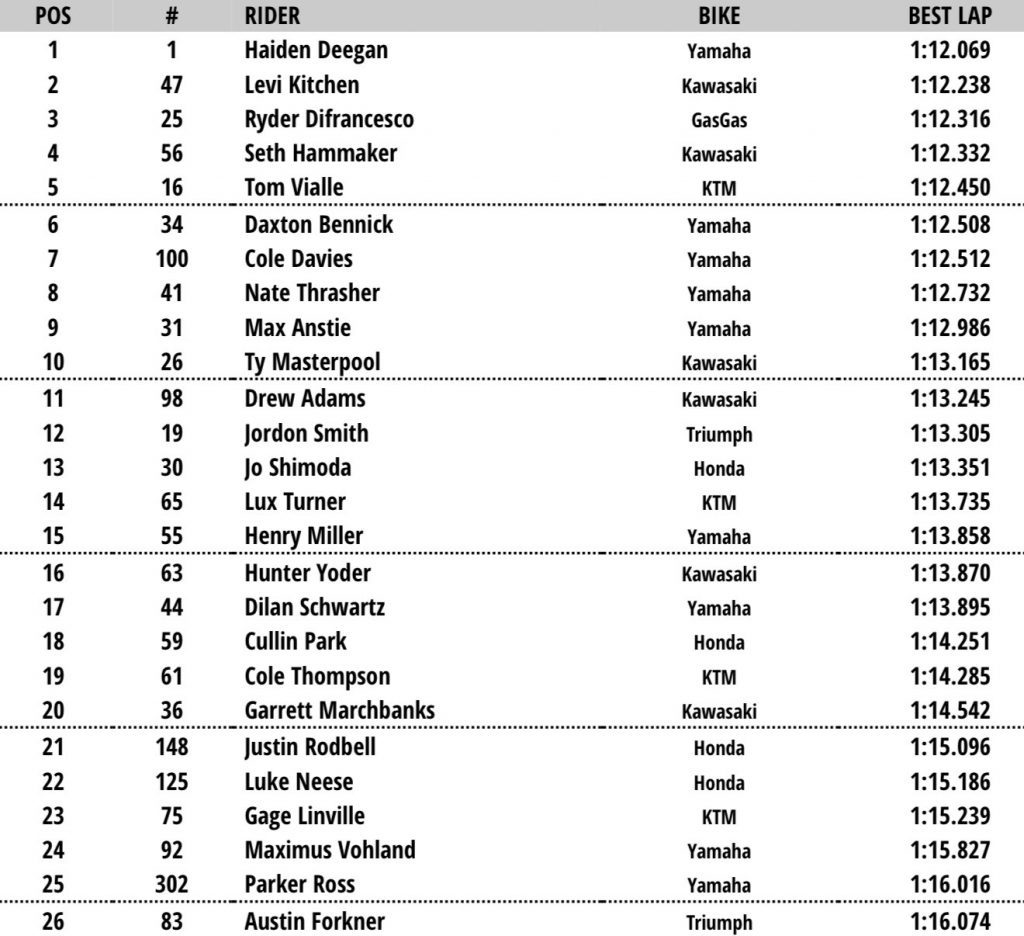 Jo Shimoda edged Haiden Deegan by a tenth of a second right at the end of the session as Jett Lawrence went quickest in the 450s with Chase Sextok just a tenth off in second and Eli Tomac third.