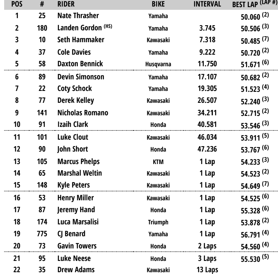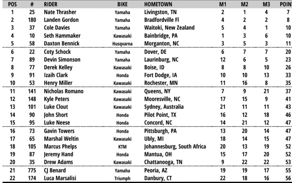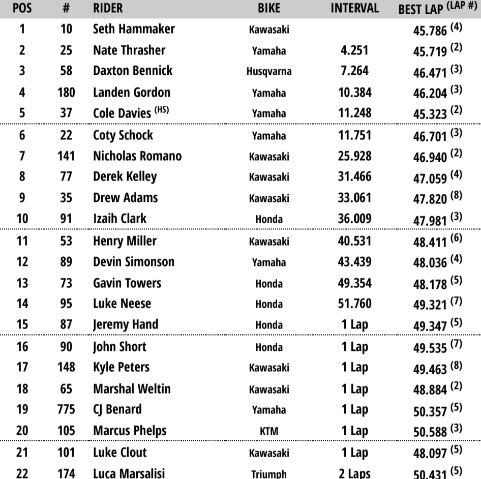 Moto one: Seth Hammaker took the win after Cole Davies made a rare mistake when he crashed while second trying to find a way by his teammate Natw Thrasher. Davies would finish fifth.