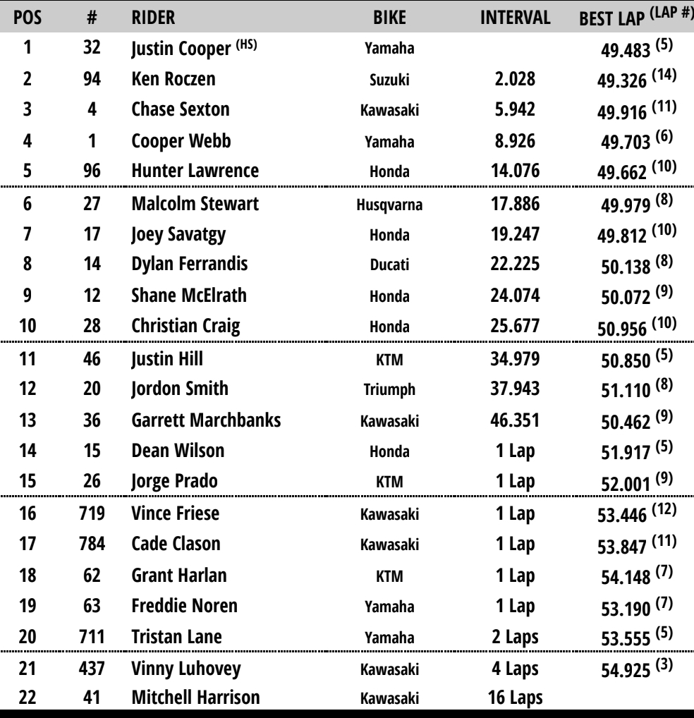 Justin Hill passed Sexton late for third in the moto but it was Justin Cooper who, despite jumping over a berm and off track, still secured a podium with seventh. Cooper Webb took second overall, and is now third in points, 22 off the lead.