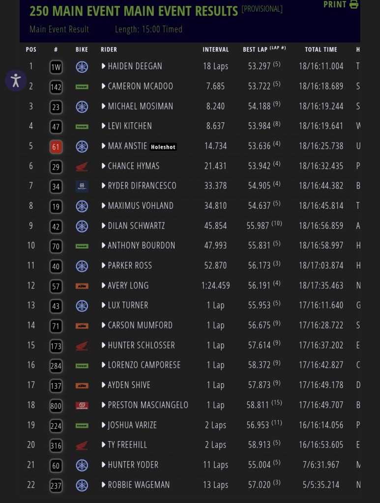Haiden Deegan put a block pass on Max Anstie for the lead and the win as Anstie got stuck under the bike eventually taking fifth with Kitchen going down on the first turn AGAIN and coming back to fourth.