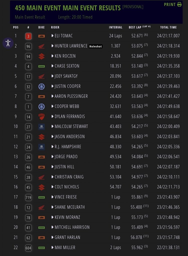 Eli Tomac, Hunter Lawrence and Ken Roczen put on a classic with Tomac taking the win over Lawrence and Roczen with Sexton hitting the gate and coming back fourth – putting Webb down on his surgery through the pack.