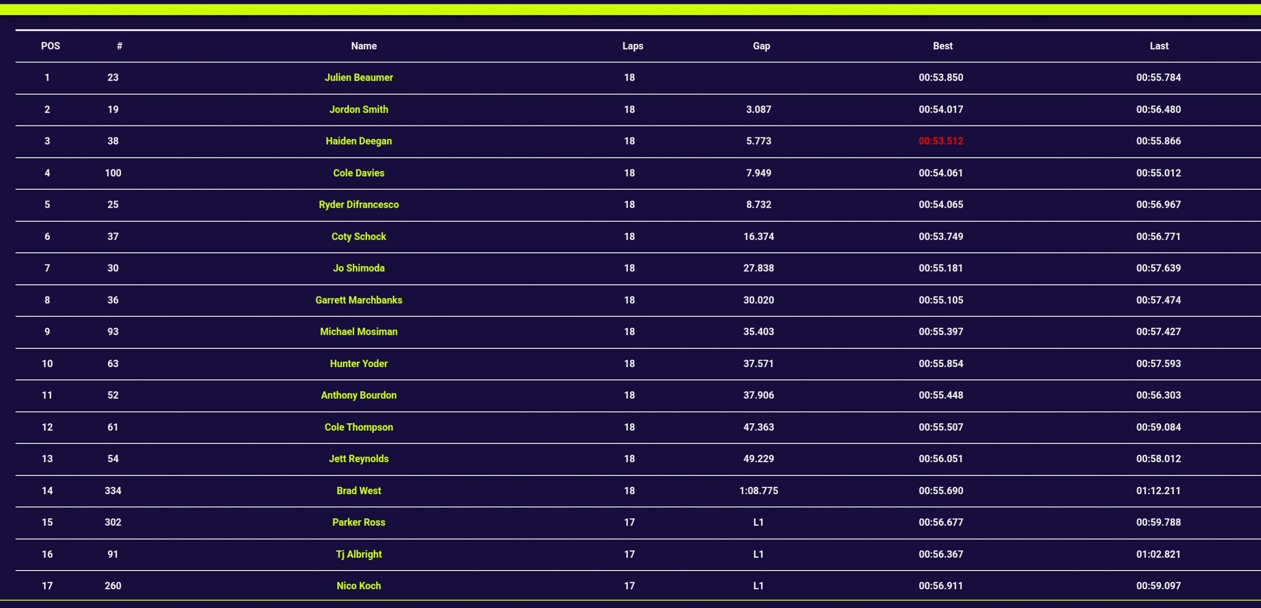A big mistake by Di Francesco let Deegan into third as Beaumer upped the pace to try and keep his gap over Smith and a charging Deegan. Ultimately Smith did a good job keeping Beamer in sight and that kept Deegan at bay and as Beaumer took control of the championship with the first win of his career! Davies got Di Francesco for fourth on the line for his best result of his short career with a brave Shimoda braving the pain of two broken fingers for seventh.