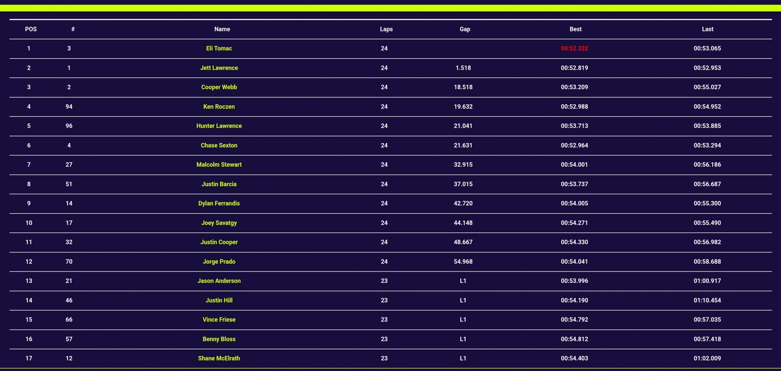 Cooper Webb took the holeshot as Chase Sexton narrowly avoided being landed on on the triple mid-pack only to crash in the turn before the whoops and have to come from last! Jett Lawrence and Eli Tomac then went at just inside the top five with Tomac getting the edge before both pulled their way up to 1-2 and the race was on between Jett and Tomac for the win!