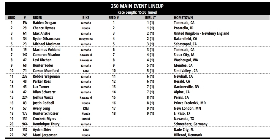Haiden Deegan took the win but took his time to run down teammate Michael Mosiman for the win with Mosiman a great second and DiFrancesco third. Max Anstie had a bad start, got up to sixth then went off track; dropped to tenth and came back to sixth.