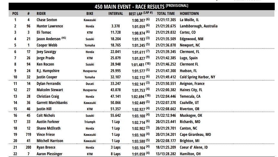 Hunter was closing late but backmarkers not moving over on the blue flags cost him the chance at the win as Sexton took a huge win for himself and Kawasaki with championship leader, Tomac settling for third. Cooper Webb crashed while fourth to end up fifth.