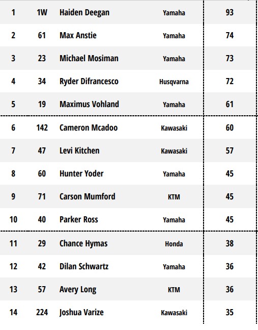 Deegan ran down rival Levi Kitchen for the win with an aggressive block pass and gave him the look back and finger guns over the finish line to let Kitchen know he just beat him again! McAdoo again took third in another good ride with Anstie having another bad start, taking sixth.